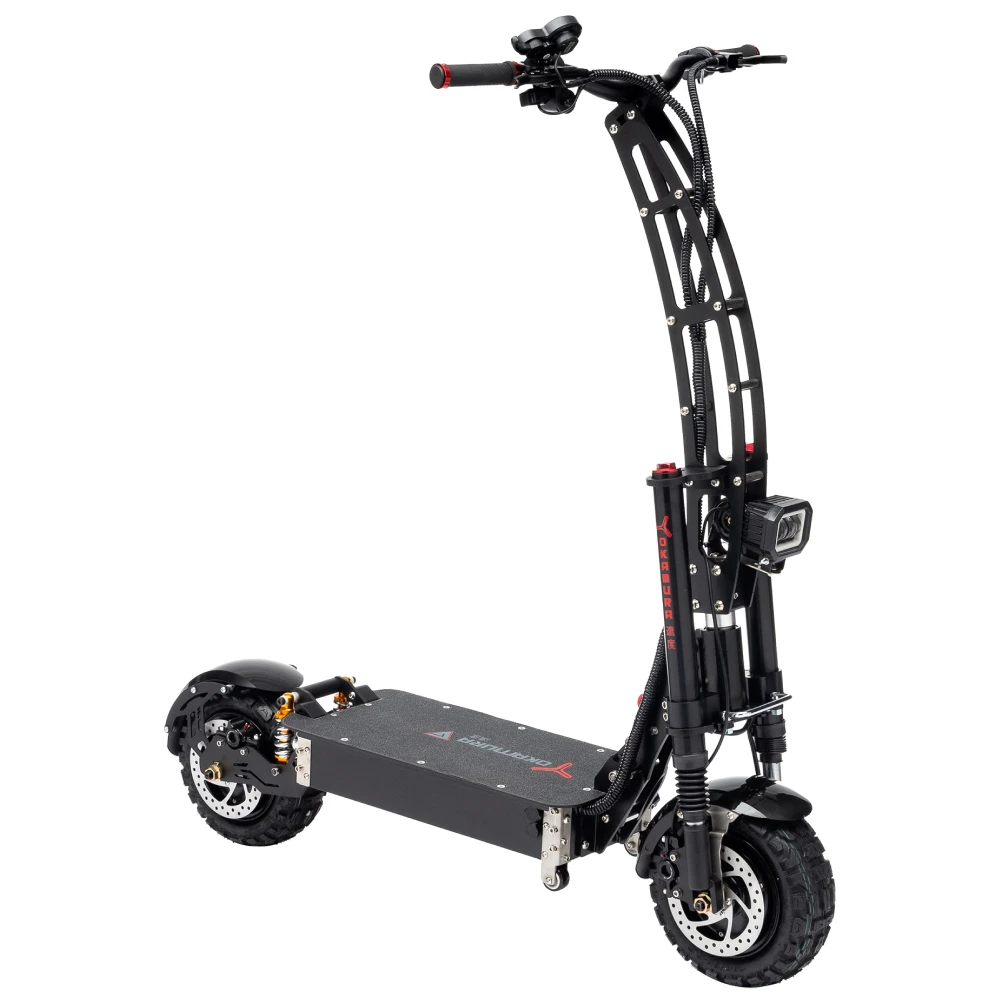 YOKAMURA G электросамокат на 11 дюймовых колесах, мощность двух двигателей составляет 6000 Вт. Один двигатель отключается кнопкой на руле. При спокойном передвижении можно экономить заряд аккумулятора. Его емкость составляет 30 А*ч, напряжение 60 вольт. Предусмотрено внешнее освещение, фара впереди.