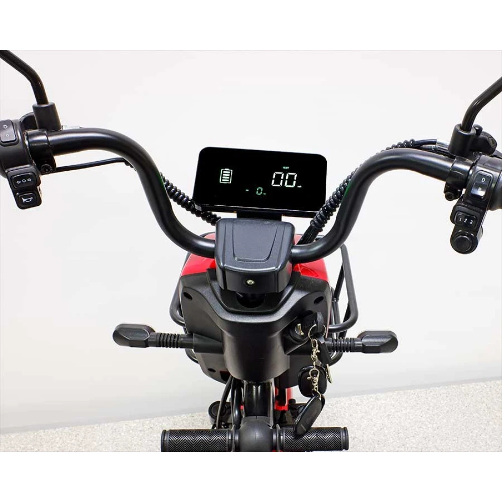 Дифференцированный мотор мощностью 500 Вт достигает максимальных скоростных показателей в 25 км/час за короткое время. Питание на двигатель подается гелевым аккумулятором емкостью 20 Ач с напряжением 60 В. Пользователь сможет пройти 60 км на одном заряде, а ресурса батареи хватит на 700 циклов заряда-разряда. Рулевая стойка имеет правильные эргономические характеристики и угол наклона, который позволит долго находиться в пути и не уставать. Модель оснащена широким сидением и удобной спинкой для комфортного передвижения. Вилка с воздушными амортизаторами позволяет преодолевать дорожные неровности легко и просто.